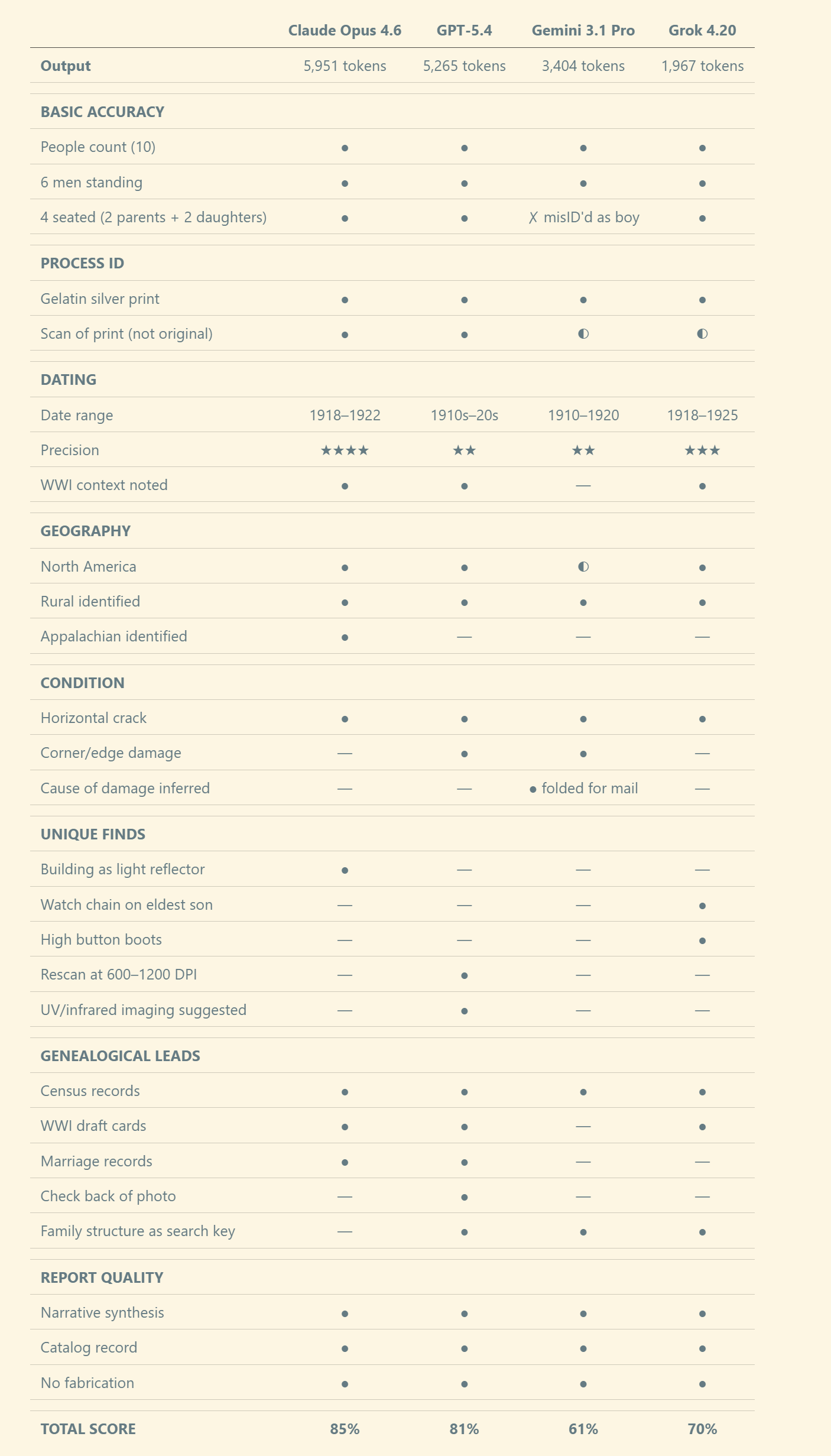Claude wins overall — strongest on dating precision (four-year window), geographic identification (the only model to recognize Appalachian architecture), and lighting analysis (noted the white clapboard acts as a natural reflector). From my perspective, this isn’t surprising — image analysis is where the architectural prompting style pays dividends, because the model has room to reason about what it sees rather than following a checklist.