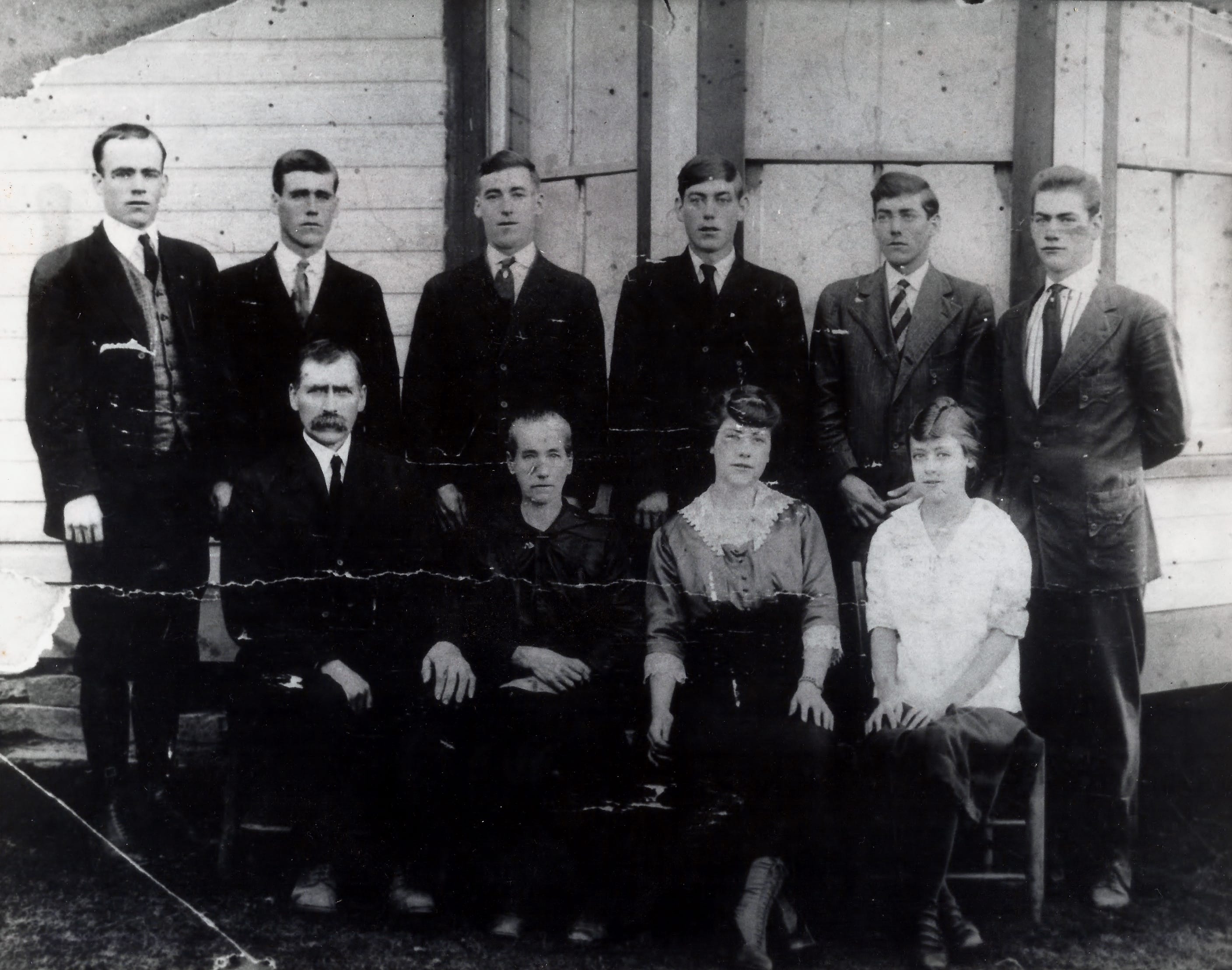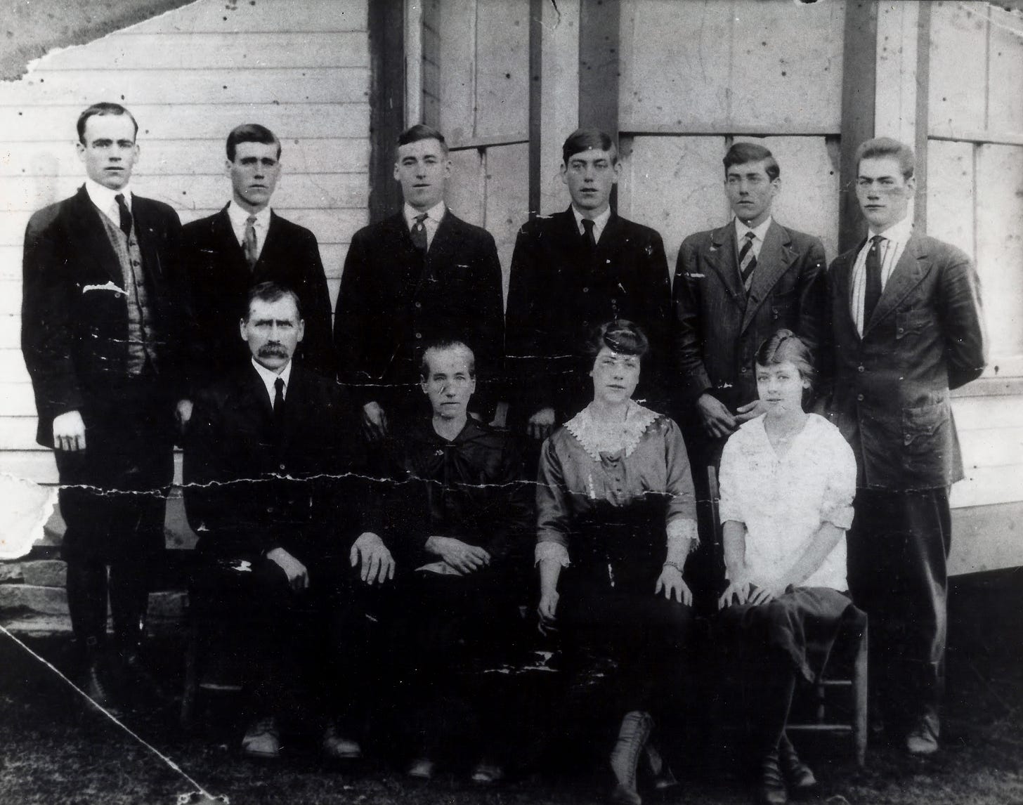 I identified the photographic process — gelatin silver print, likely a contact print from a glass plate or large-format negative. I dated the clothing to approximately 1918-1922 based on the younger daughter’s transitional hairstyle trending toward the 1920s bob, the men’s narrow lapels and high-buttoned jackets, and the patriarch’s handlebar mustache. I noted the horizontal crack running across the print — damage to the paper, not the negative — and cataloged its severity. I described the white clapboard building behind them well enough for a designer to recreate the scene from text alone. I extracted structured data into tables with confidence ratings — High, Medium, Low — for every claim. I produced a catalog record with alt-text. And then I told Steve which census records, draft cards, and marriage registers to search next.