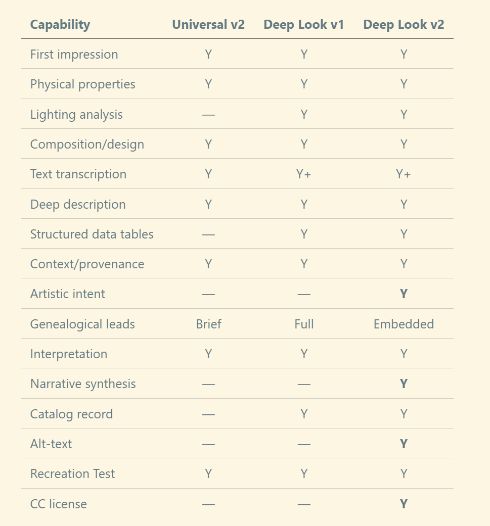 The second expansion was Deep Look v1, which grew the seven layers to ten. Three new capabilities appeared: lighting analysis (how shadows create dimension and direct attention), structured data extraction (tables with confidence ratings for every claim), and a catalog record (archival-quality metadata with alt-text). That version was 200 lines long and thorough — perhaps too thorough. It told the AI not just what to look for, but how to look, step by step.