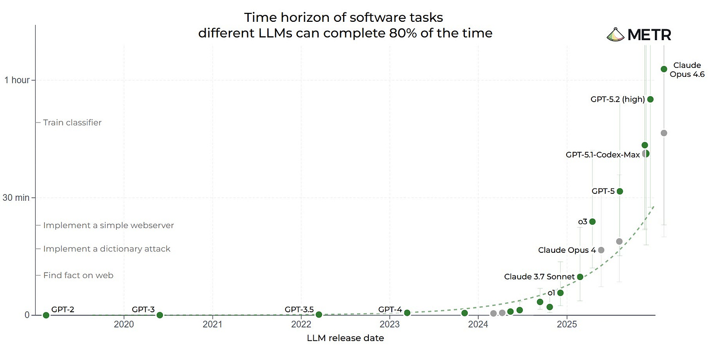 Meanwhile, METR — an independent research organization that measures how long AI can work autonomously on real-world tasks — shows AI task autonomy doubling every four to seven months. Shumer, who cites their data in his essay, notes that the most recent measurement hasn’t even been updated to reflect the February 5th models.
