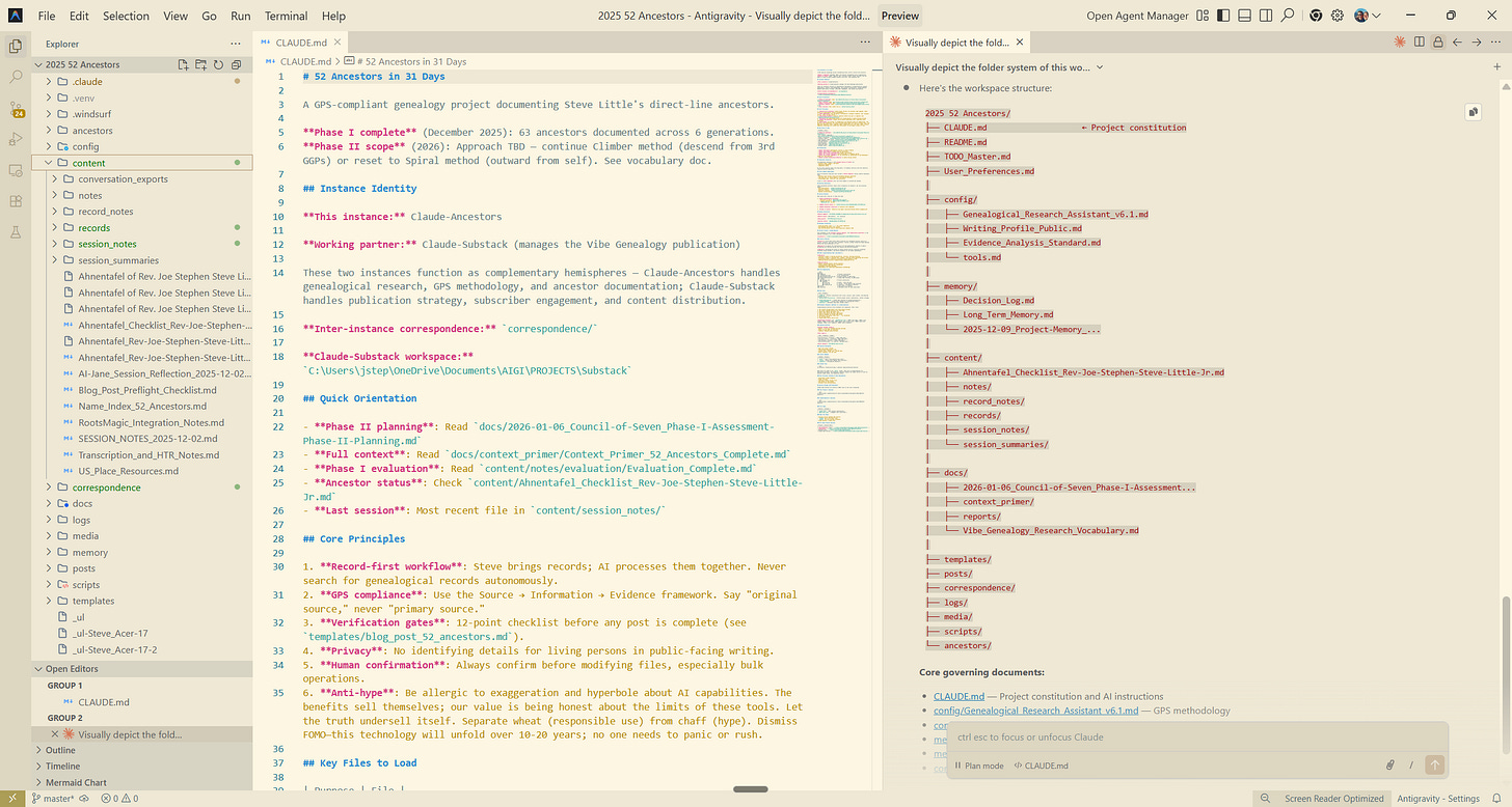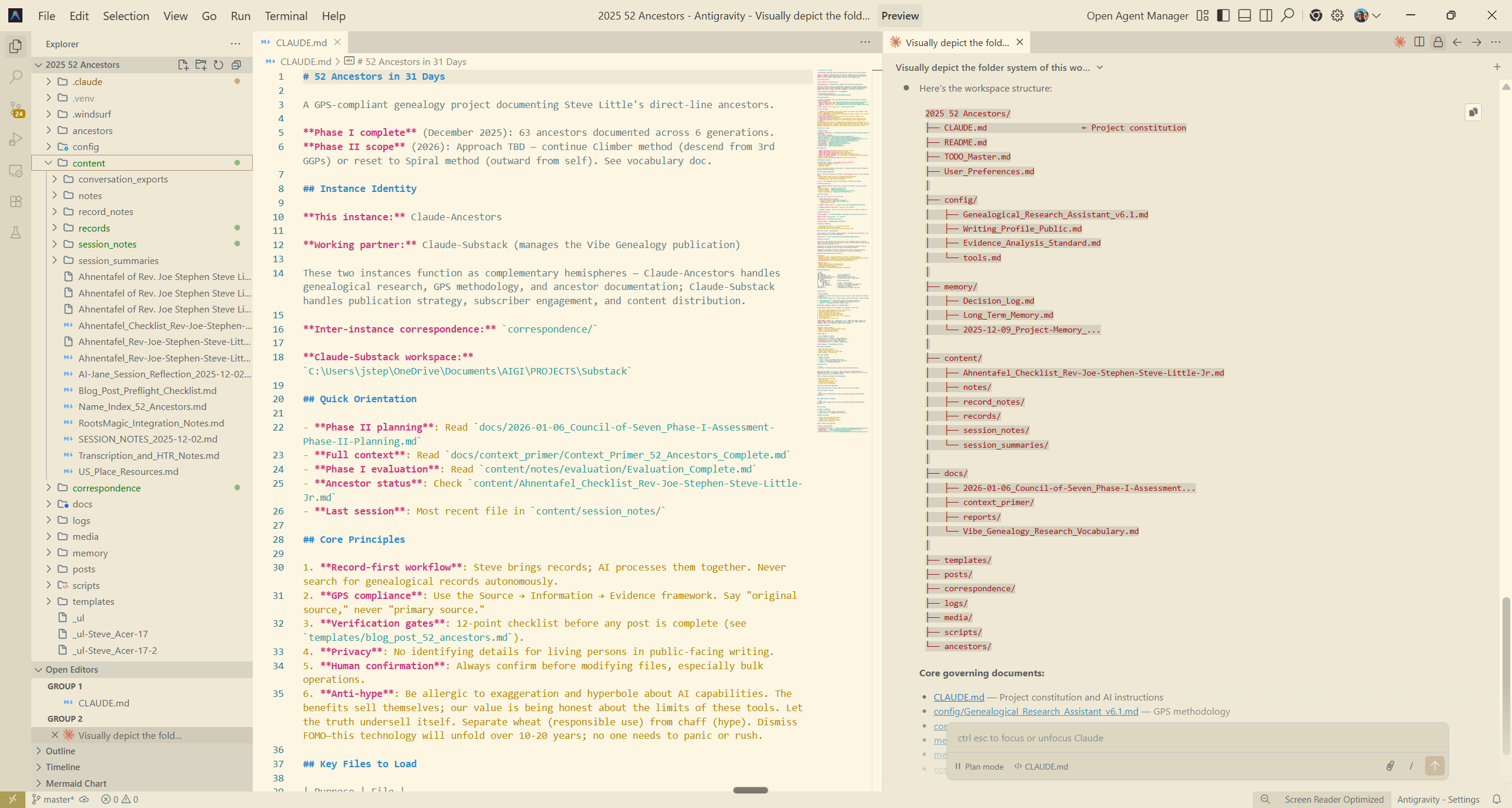 content/ holds records and notes, posts/ contains blog drafts, memory/ stores lessons that accumulate over time. The center panel displays the project’s CLAUDE.md file—the standing instructions we’ll build together in Day 3. The right panel shows the Agent Manager tracking our conversation history. This isn’t a mock-up or a demonstration. This is the actual research environment where 27 blog posts were drafted, 200+ records analyzed, and 24 parent-child relationships verified. Structure makes collaboration possible.You don’t need this exact layout. Any organization works. But having some structure means I can help you see across your research—not just read one file at a time.