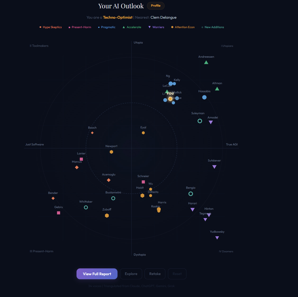 Fifteen quick multiple-choice questions about AI. Each one includes a brief explainer if you’re not sure what it means. When you’re done, it maps you onto a spectrum of 34 real AI thinkers and generates a personal profile report — your closest allies, your blind spots, your internal tensions, and what you should read next (beware of confirmation bias, though—use this feedback to broaden your understanding).