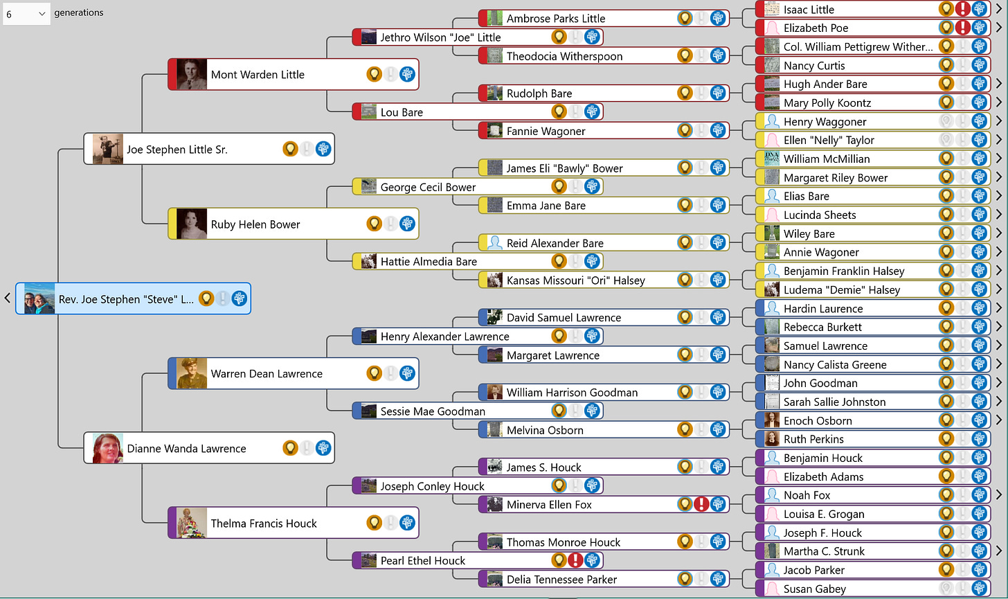 Phase One traced Steve’s direct lineage—one person in each generation, doubling as we moved backward: 1 → 2 → 4 → 8 → 16 → 32. That’s the Ahnentafel structure. By Generation 6, we’ve documented 32 third great-grandparent couples, a total of 63 individuals, including Steve.