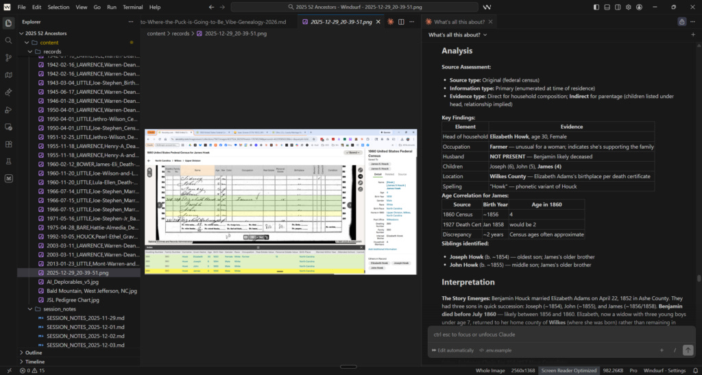 This post is part of the Vibe Genealogy series at AI Genealogy Insights, exploring the frontier of AI-assisted family history research. For the genealogical results of tonight's session, see "The Night of Nine" at Ashe Ancestors. For background on the project, see "Vibe Genealogy: Here Comes the Sun."