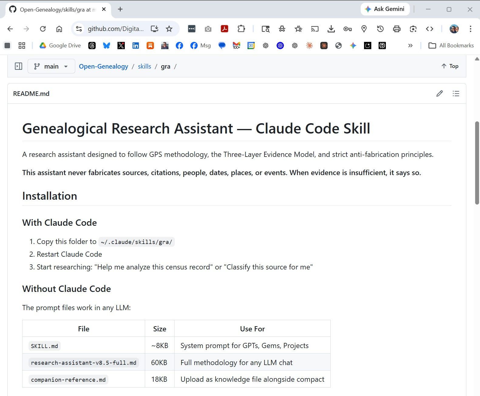 Install the GRA as a skill and it loads automatically whenever Claude detects a genealogical research question: