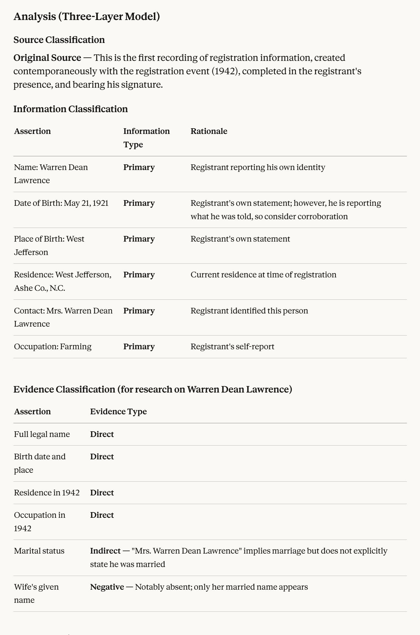 Here is what the GRA produces when you hand it a single historical record and ask it to apply Elizabeth Shown Mills’ Three-Layer Evidence Model.