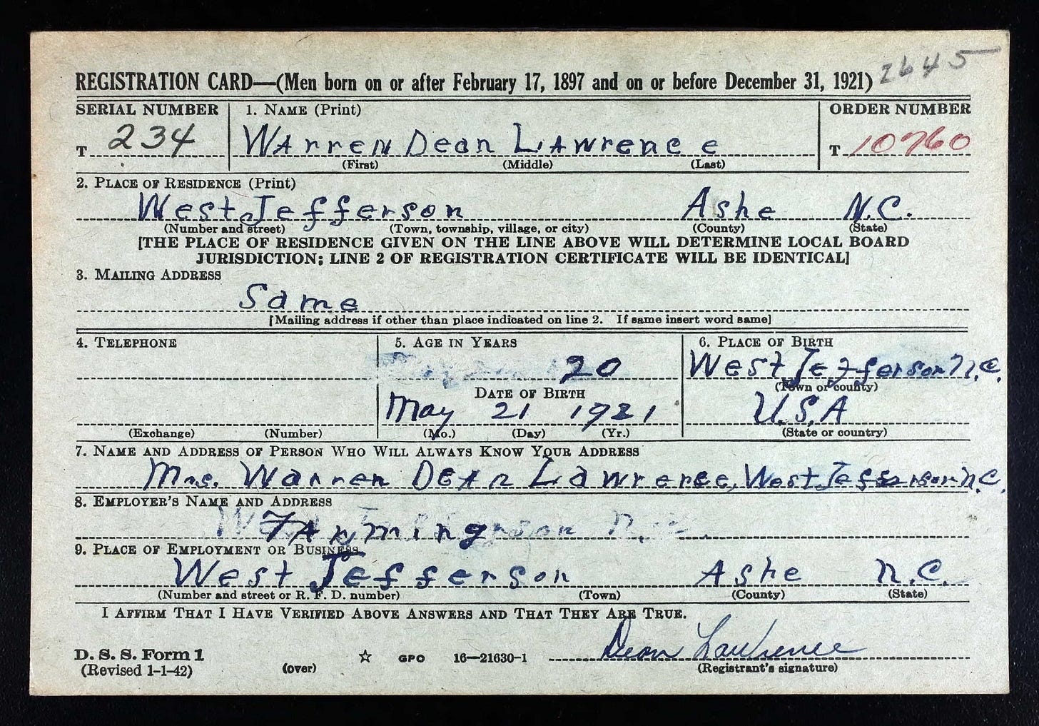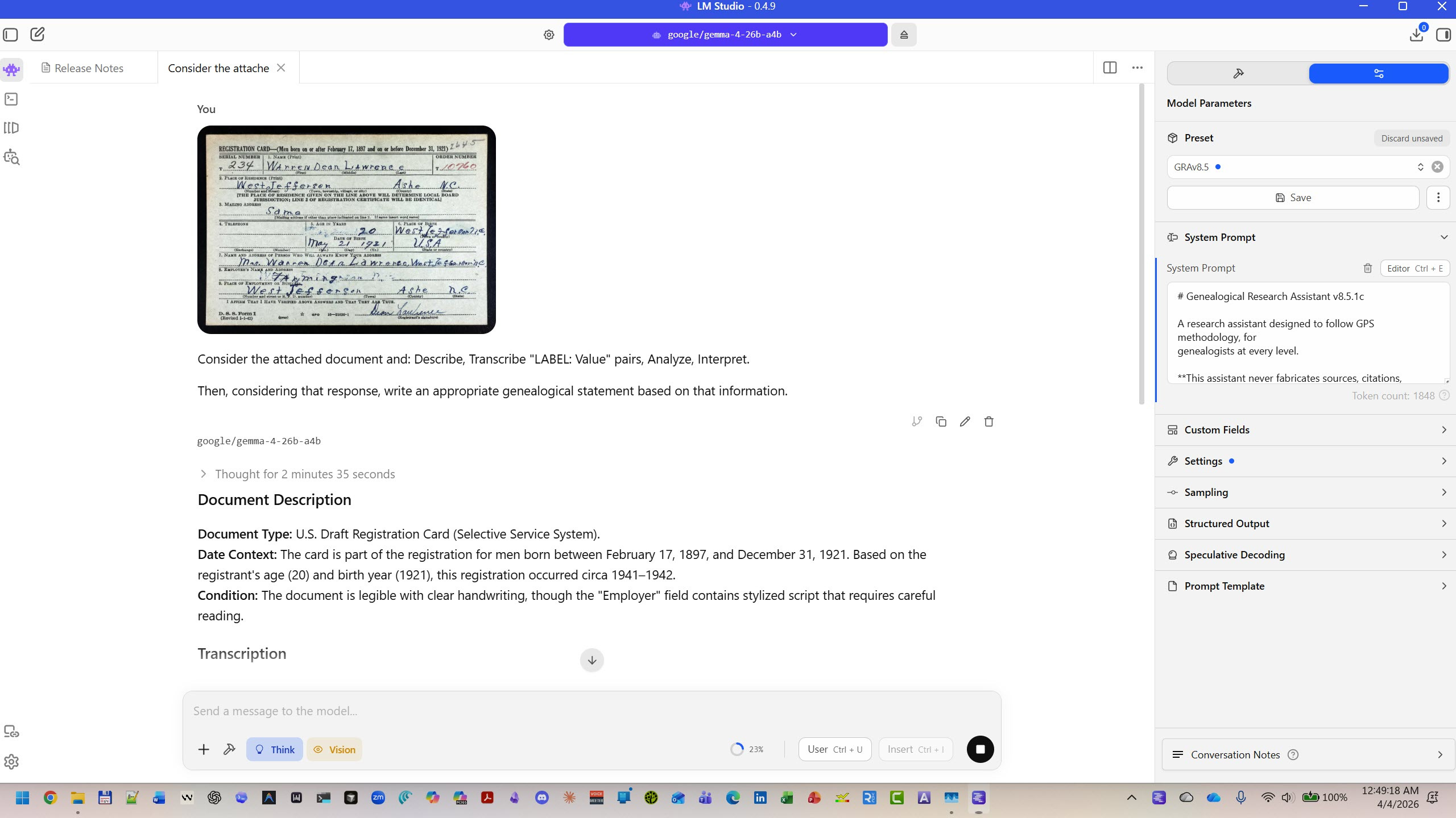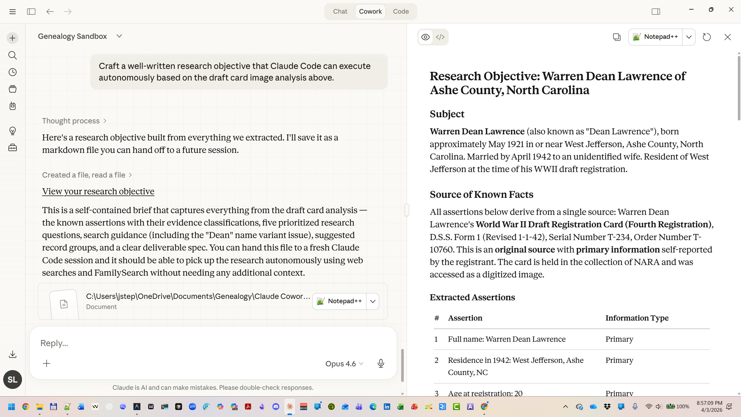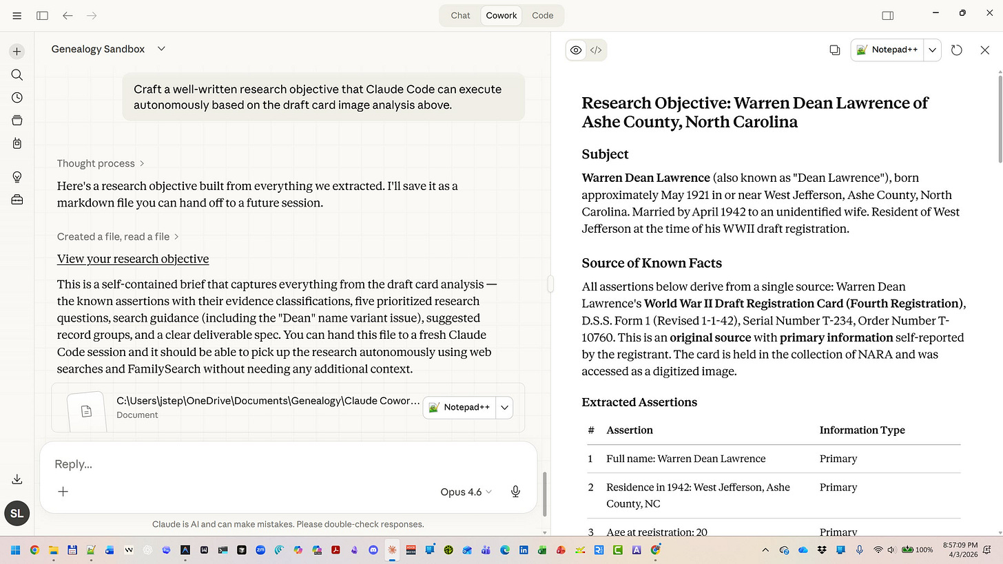 To show you what all of this looks like in practice, I’m going to walk you through one document — a 1942 WWII draft registration card for a Steve’s material grandfather, Warren Dean Lawrence, of Ashe County, North Carolina — analyzed through six different tools, from the simplest to the most advanced. Same document. Same methodology. Six different ways to get there.