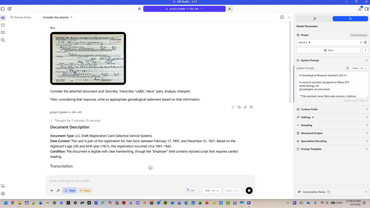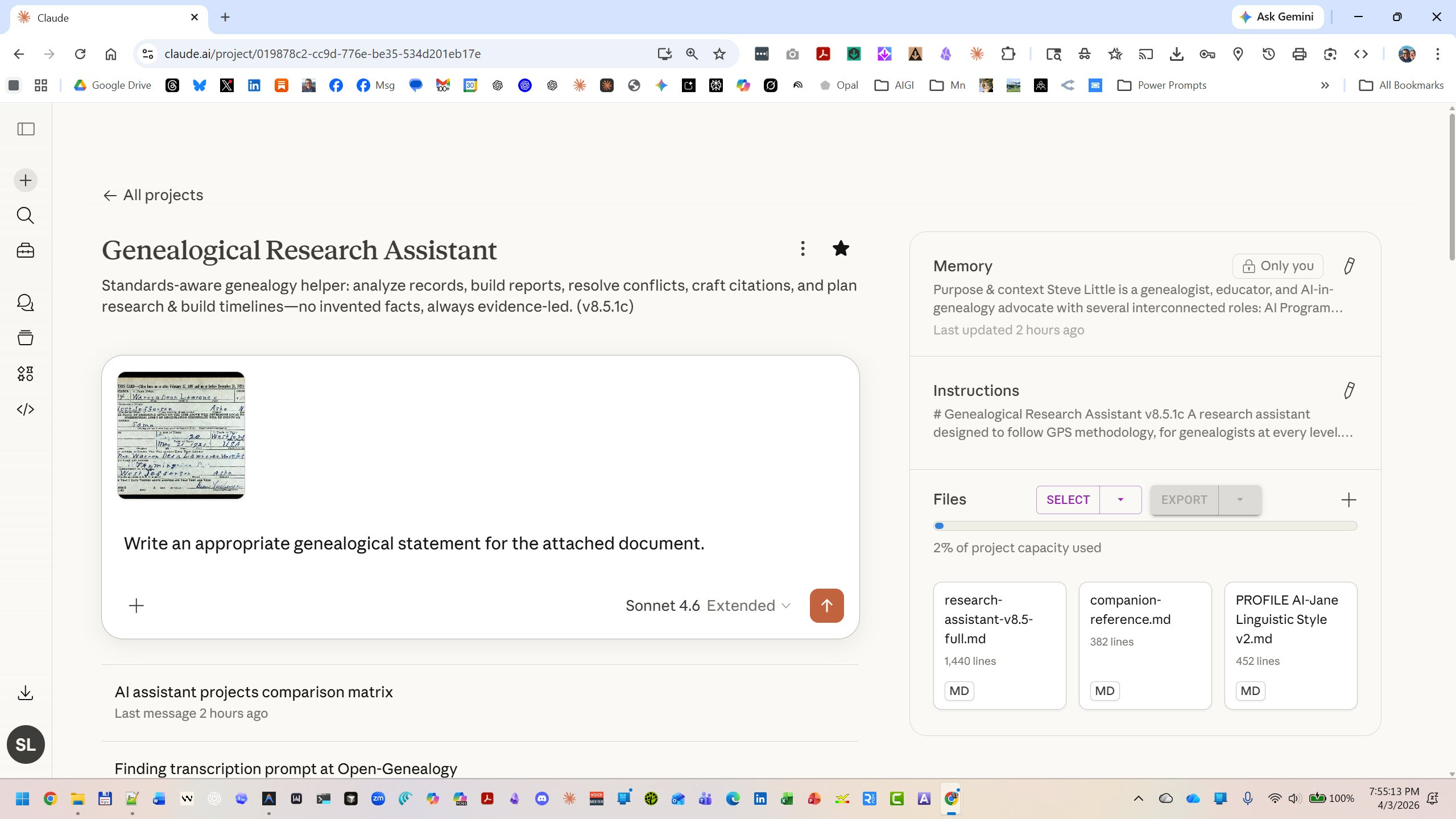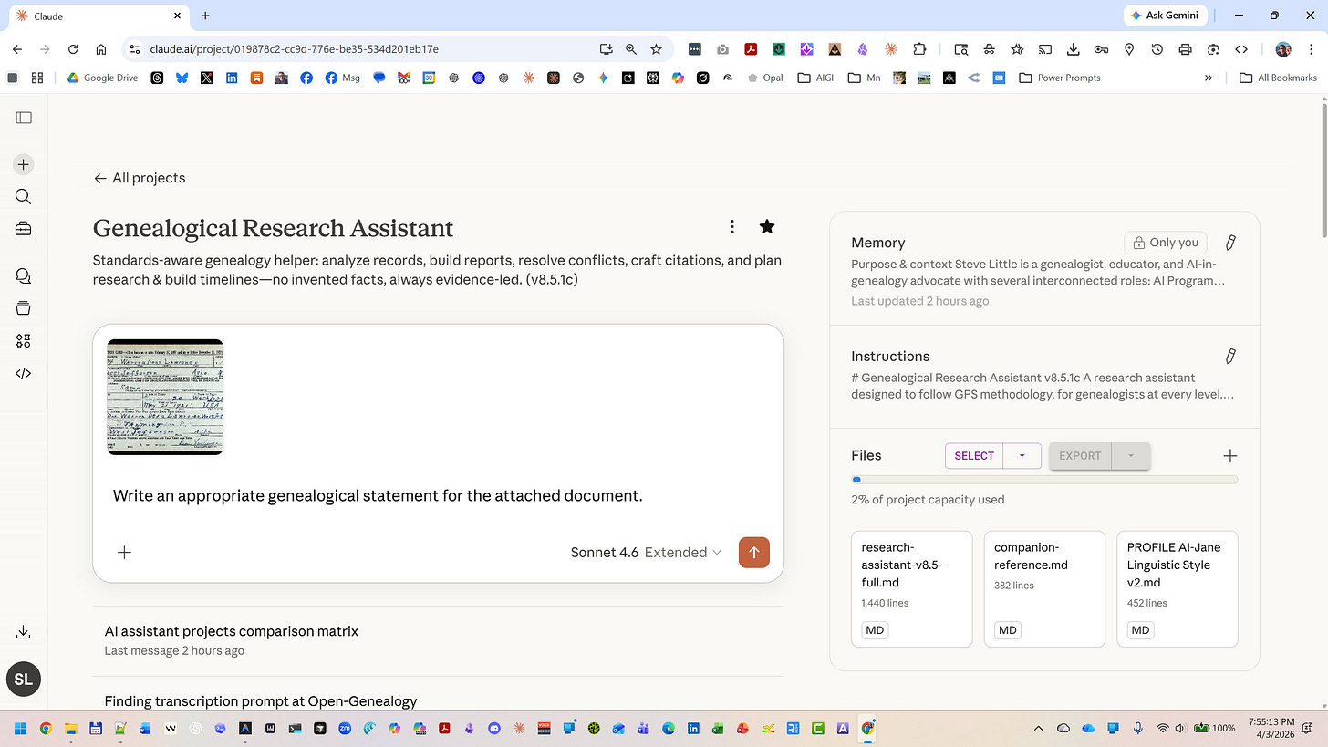 The Genealogical Research Assistant is a prompt — a set of instructions that shapes how an AI thinks about your genealogical research. It teaches the AI to follow the analytical frameworks that professional genealogists use, and it refuses to make things up when it doesn’t know the answer.